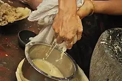 Traditionally, people of tulunadu used to clean the surroundings of paale mara the previous day of new moon day and tie the tree with rope dry banana leaves and keep a stone under the tree. So, they can identify the paale mara easily in the early morning and pray with the tree, "Hey divine Tree, you fill with the entire medicinal aspects tomorrow. Please bless with good health after having your bark/skin".[4] It also has divine status in this region. On aati amaase day, (the next day) before sunrise the bark/skin of the paale mara should be collected with the help of a stone and decoction prepared from it. The special care should be taken in the identification of the tree. Very outer skin(black coloured) is removed and inner white part is crushed by adding a little water, to make kashaya. The tree bark is grinded by using a stone.[5] And this ayurvedic concoction is prepared by mixing ingredients of pepper, turmeric, ajwain, garlic, and seeds into it. And scorch a pebble or iron bar and place in the decoction. After oblation to god and finally people intake the Kashaya. It tastes highly bitter, because it has ensemble medicinal contents. This juice is called Paaleda kashaya.[6]