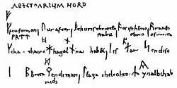 The Abecedarium Nordmanicum is on the same page as the Abecedarium anguliscum (the Anglo-Saxon runes). There are interlineal glosses for some of the runes specific to the Younger Futhark, giving their Anglo-Saxon phonetic equivalents: ᚼ hagal is glossed with ᚻ haegl, ᛅ ar with ᚪ ac, ᛙ man with ᛗ man, and ᛦ yr with ᚣ yr. The content of the poem are the names of the runes, connected by a few additional alliterating words as mnemonical aids. For the r, m and l runes, the Anglo-Saxon names are given rather than the Scandinavian ones, as rat, man and lagu for reidh, madr and logr, respectively. The Anglo-Saxon runes ᚹᚱᛠᛏ (wreat) written underneath the feu forman of the first line. It is not clear whether they should be considered part of the poem's text.
