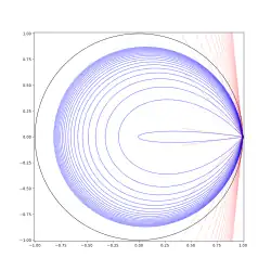 20 Stolz sectors, for ranging from 1.01 to 10. The red lines are the tangents to the cone at the right end.