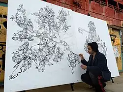 His paintings, drawings and digital works have featured in the following exhibitions: "Heroes and Villains: the Battle for Good in India's Comics" at the Los Angeles County Museum of Art (LACMA);, "Transcendent Deities of India: The Everyday Occurrence of the Divine" at the Asia Society in Houston, Texas; at the ghats of Varanasi, India; a social impact project organized by Ojas Art Foundation, other exhibitions include "Dhyana Roopa" at the Academy of Fine Arts and Literature in Delhi, "India Imagined" sponsored by the Nirula Family Art Trust and at the visionary Fractal Gallery at Burning Man sponsored by the Black Rock Arts Foundation.