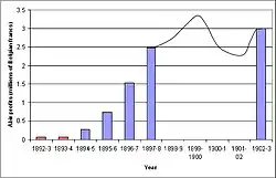 Abir collected 70 tons of dried rubber in 1895, rising to 410 tons in 1898 by which time it had eleven operational posts.[13] At the same time the price of rubber also increased from 6.30 to 6.50 fr per kilogram in 1894 to 8.04–10.00 fr per kilogram in 1898. Abir's costs in 1897 amounted to 0.25 fr per kilogram to purchase the rubber from the collectors (in lieu of tax), 0.4 fr for transportation, 0.25 in export duty paid to the Congo Free State and 0.45 for storage for a total cost of 1.35 fr per kilogram.[13] In the same year Abir could sell on the rubber in Europe for up to 10 fr per kilogram.[16] Abir's profits rose with the increasing quantity and price of rubber, for the first two years (1892–94) the company recorded a total profit of 131,340 fr, this had increased almost twentyfold by 1898 when they recorded a 2,482,697 fr profit just for one year.[17] As a result, the dividend paid in 1898 was 1,100 fr per 500 fr share.[18] These profits were made in spite of increasing costs due to the doubling of export duty in 1892 and the construction of the Leopoldville-Matadi railway in 1894 which increased the cost of moving rubber to the coast to 0.63 fr per kilo, more than the entire trip to Antwerp had taken in 1892.[11]