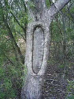Scarred trees result from removing bark for the manufacture of shields, coolamons, shelters and other utensils can be found where appropriate species of tree of sufficient age survive. Some trees were marked with designs and symbols. A large river red gum with a canoe scar is located at Heide Gallery in Bulleen.