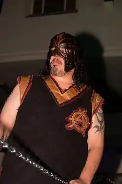 On the June 14 episode of Impact!, Abyss returned, losing a King of the Mountain qualifying match to Cage by disqualification.[2] Following the match, Abyss attacked the referee, security, and several members of TNA staff while Cage escaped. At Slammiversary on June 17, Abyss gained a measure of revenge on Cage, defeating his ally Tomko in a No Disqualification match that ended after he gave Tomko the Black Hole Slam onto glass.[15] After Slammiversary, Abyss aligned himself with former rival Sting and spoke for the first time in TNA, saying "Tomko... Styles... 3 days... Click... DOOMSDAY!", the phrase used by former manager James Mitchell. Abyss and Sting defeated Tomko and A.J. Styles at Victory Road on July 15, but not without receiving a message from James Mitchell himself, telling the two that his son, Judas Mesias, was coming to TNA.[2] Abyss and Sting continued to feud with Christian's Coalition after the event. On the July 26 episode of Impact Abyss battled Styles in a No Disqualification match. During the match Abyss was dragged under the ring and when he re-appeared, he was covered in blood. Styles pinned Abyss after Tomko had slammed him onto a pile of thumbtacks and broken glass.[16] The following week Abyss and Sting defeated Cage and Styles in a ladder match, after an assist from the debuting Andrew Martin.[2] By winning the match, Abyss could make a match against Cage, picking a Doomsday Chamber of Blood match at Hard Justice on August 12 with Abyss teaming with Sting and Martin to face Cage, Tomko, and Styles.[17] At Hard Justice, Abyss's team would win the match when Abyss pinned Styles, thus earning Abyss the number one contendership to the TNA World Heavyweight Championship.[17] The following Impact!, Abyss successfully defended his contendership against Cage in a First Blood match, but was attacked by TNA World Heavyweight Champion, Kurt Angle.[2] The last Impact! before the event had Abyss score a pinfall victory over Angle in a tag team match, where he teamed with Jay Lethal to face Angle and Sting.[2] At No Surrender on September 9, Abyss fell to Angle after tapping out to the ankle lock.[18] Following the bout, James Mitchell appeared, and a hand ripped through the ring and dragged Abyss into the ring.[18] Abyss faced Angle in a rematch on the following Impact!, this time in a Six Sides of Steel match. Abyss had Angle in Angle's ankle lock maneuver, when Judas Mesias appeared, coming out through the ring and attacking Abyss. Angle escaped, while Mesias choked out Abyss with barbed wire in the ring.[2] Two weeks later Abyss returned to attack Mesias and Angle, who were assaulting Sting and Rhino.[2]