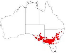 Gold dust wattle is widespread from near Melrose in South Australia, including in the Mount Lofty Ranges, Kangaroo Island and southern Flinders Ranges, throughout most of Victoria, and south from the Gilgandra district in New South Wales. It is often found in hilly country and grows well in sand, sandy loam and gravelly soils as a part of Eucalyptus woodlands, woodland heath and open mallee scrubland communities.[3][4][5][6][7]