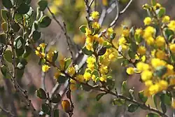 Acacia acoma is an erect, spindly, open or spreading shrub that typically grows to a height of 0.5–3 m (1 ft 8 in – 9 ft 10 in) and has smooth bark. Its phyllodes are variably-shaped, from narrowly oblong to elliptic or egg-shaped with the narrower end towards the base, mostly 15–30 mm (0.59–1.18 in) long and 7–12 mm (0.28–0.47 in) wide and often sessile. The flowers are borne in a 2-headed raceme 0.5–1 mm (0.020–0.039 in) long on a peduncle 8–21 mm (0.31–0.83 in) long, the heads spherical, 5–6 mm (0.20–0.24 in) in diameter with 30 to 37 golden-yellow flowers. Flowering occurs from July to October, and the pods are strongly curved or spirally coiled, up to 15 mm (0.59 in) long when expanded and 2–3 mm (0.079–0.118 in) wide, containing mottled black and yellowish green seeds 2.5–3.0 mm (0.098–0.118 in) long with a creamy-white conical aril.[3][4][5][6]