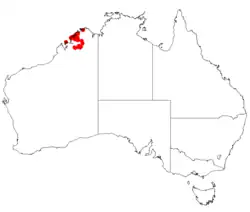 Acacia adenogonia is native to an area in the Kimberley region of Western Australia.[2] The shrub has a scattered distribution with separate populations found through the West Kimberley particularly along the Bonaparte Archipelago, the Broome and Napier Bay areas, and inland as far as Phillips Range, Kimberley Downs Station and Beverley Springs Station, and is found on areas of sandstone growing in sandy soils as a part of woodland communities.[4]