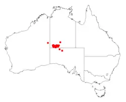 Mount Conner wattle is found in arid parts of inland Australia where it has a limited distribution in the north-western parts of South Australia and southern parts of the Northern Territory between 130 km (81 mi) and 50 km (31 mi) west of Uluru, where it is often grows on the upper slopes of hills and ranges in sandy or gravelly soils on upper slopes of ranges.[3][4]