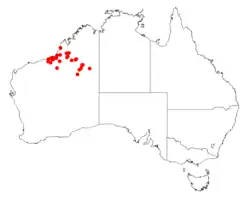 This species of wattle is endemic to arid areas in the Kimberley and Pilbara regions of Western Australia where it is often situated on sand dunes and pindan country growing in red sandy or sandy-loamy soils.[7] The range of the plant extends from the northern boundary of the Pilbara region northwards to around Broome in the north west to around Kumpupintil Lake and Lake Gregory in the east and is sometimes found on heavier, sometimes saline, soils.[2]