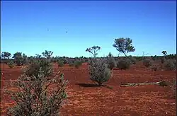 Mulga scrub is distinctive and widespread, with the Mulga Lands of eastern Australia defined as a specific bioregion. The dominant species in these woodlands is mulga, with poplar box (Eucalyptus populnea) forming an increasingly important codominant in the eastern districts.[15][16] The extent of ground cover in mulga woodlands varies with canopy density of the overstorey, becoming almost nonexistent in extremely dense stands. In more open stands, the herbaceous layer consists of wire grasses (Aristida spp.), mulga oats (Monocather sp.), mulga mitchell (Thyridolepis sp.), wanderrie (Eriachne spp.), finger grasses (Digitaria spp.) and love grasses (Eragrostis spp.). Various other woody species are also significant in mulga woodlands, particularly hop bushes (Dodonaea spp.), Eremophila and cassia (Senna spp.).[14][16]