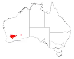 This acacia is found in yellow sand in sandplain heath and is found from Bruce Rock and east to Boorabbin and Coolgardie in the Avon Wheatbelt and Coolgardie bioregions in the south-west of Western Australia.[6][7]