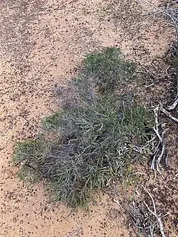 Acacia bidentata is a prostrate or domed shrub that typically grows to a height of up to 50 cm (20 in) and has branchlets with scurfy white hairs. The phyllodes are egg-shaped to triangular with the narrower end towards the base, mostly 4–7 mm (0.16–0.28 in) long and 2.5–5 mm (0.098–0.197 in) wide. The flowers are borne in up to three spherical to oblong heads in axils, on a peduncle 3–10 mm (0.12–0.39 in) long, each head with 10 to 16 creamy white or pale yellow flowers. Flowering occurs from about July to October and the pods are thinly crust-like, glabrous, strongly curved to coiled, 3–4 mm (0.12–0.16 in) wide containing oblong seeds 3.0–3.5 mm (0.12–0.14 in) long with an aril.[2] [3][4]