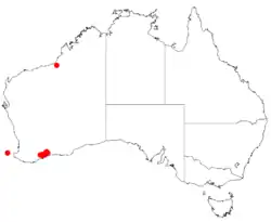 This species of wattle is found in mallee and woodland between Ravensthorpe and the Fitzgerald River in the Esperance Plains bioregion of the southern part of the south-west of Western Australia.[4][5] It is often found in clay, rocky loam or sandy soils on undulating plains, low-lying areas and on roadsides.[1]