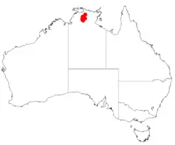 This species of wattle is endemic to the Northern Territory where it grows in red kaolinitic soil in the Arnhem Plateau and Pine Creek bioregions in Kakadu and Nitmiluk National Parks.[2][7]