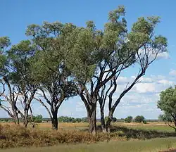 Confined to regions between 550 and 200 mm annual rainfall,[11] A. cambagei is found primarily on flat and gently undulating terrain on heavy and relatively fertile clay and clay-loam soils in the eastern part of it range, and often forms mixed communities with brigalow which favours the same soil types. In drier regions, gidgee is found primarily on red earths and loams in wetter depression and low-relief areas. Gidgee communities are floristically similar to brigalow communities. Eucalyptus cambageana, E. populnea, Corymbia terminalis, Eremophila mitchellii and Geijera parviflora are typical woody species associated with gidgee communities.[12]
