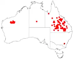 Subspecies occidentalis is confined to the Pilbara and Gascoyne bioregions of Western Australia, where it grows in hardpan or undulating country near watercourses or colluvium, sometimes on low, dry, rocky hills.