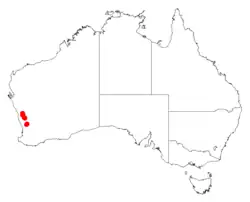 Acacia chapmanii subsp. australis grows in sand and sandy gravel in low heath in plains and swampy areas, as is only known from near Bolgart in the Avon Wheatbelt and Jarrah Forest bioregions.[8][13] Subspecies chapmanii grows in sand, laterite and clay loam, sometimes on saline flats, in heath, scrub and disturbed areas, and is only known from near Three Springs and Marchagee in the Avon Wheatbelt and Geraldton Sandplains bioregions.[11][14]