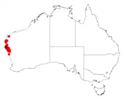 This species of wattle is native to an area along the west coast of Western Australia from near Shark Bay to the Murchison River and near Cape Cuvier where it grows in sand or sandy clay on sandplains or sand dunes in tall, dense shrubland[3] in the Carnarvon, Geraldton Sandplains and Yalgoo bioregions.[3][6][5]