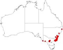 Bower wattle grows in granite-based soils in moist gullies and hillsides in forest. It occurs on the coastal plain and adjacent foothills of the Great Dividing Range south from the Nowra district in New South Wales to near Orbost with an isolated occurrence near Pokolbin in New South Wales.[2][3][4]