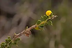 Acacia comans is a spreading shrub that typically grows to a height of 0.3–2 m (1 ft 0 in – 6 ft 7 in) and has terete, slightly ribbed branchlets that are densely covered with straight, spreading hairs. Its phyllodes are sessile, widely elliptic to oblong, 3.5–9 mm (0.14–0.35 in) long, 1.5–5 mm (0.059–0.197 in) wide and sharply pointed with three or four main veins and a gland 1.5–3.5 mm (0.059–0.138 in) above the base of the phyllodes. There are needle-shaped stipules 1.5–2.3 mm (0.059–0.091 in) at the base of the phyllodes. The flowers are borne in one or two spherical heads in axils on peduncles 5–15 mm (0.20–0.59 in) long, each head 4.0–4.5 mm (0.16–0.18 in) in diameter with 25 to 36 yellow flowers. Flowering occurs from June to September and the pods are linear, leathery, up to 45 mm (1.8 in) long and 4–5 mm (0.16–0.20 in) wide and raised over the seeds. The seeds are mottled brown, oval to more or less circular, about 3 mm (0.12 in) long with a helmet-shaped aril.[2][3][4]