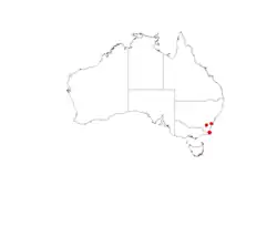 Narrabarba wattle has a limited distribution about 20 km (12 mi) south of Eden in south western New South Wales with the bulk of the population confined to the Nadgee State Forest and within the boundaries of the proposed Narrabarba Hill Flora Reserve over a range of about 3 km (1.9 mi). Another smaller population in situated in Beowa National Park. The species is found on rocky rhyolite and apatite ridge-tops with nutrient poor skeletal sandy soils but sometimes in brown to black loamy soils. The estimated population is about 6,000 individuals in an area of around 4 ha (9.9 acres).[1][7][8]