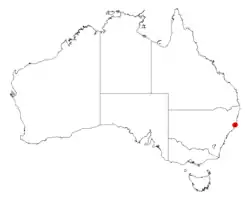 Three Brothers wattle is endemic to a small area in the mid north coast region of New South Wales around Laurieton, Kendall and Kew where it grows on rocky hillsides among the coastal ranges in three small locations in dry forests and woodland.[5] Six main populations are known, mostly in the Kerewong State Forest, and around North Brother Mountain and Middle Brother Mountain. It is often associated with species of Eucalyptus including; Eucalyptus acmenoides, Eucalyptus gummifera, Eucalyptus intermedia, Eucalyptus siderophloia and Eucalyptus umbra. Other species commonly found in its habitat include; Allocasuarina torulosa, Helichrysum elatum, Imperata cylindrica, Syncarpia glomulifera and Themeda australis.[2]