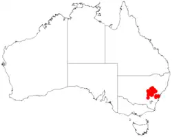 This species of watlle is endemic to inland parts of New South Wales from around Uarby and Elong Elong in the north down to around Mudgee and Yerranderie in the south and extending as far west as Parkes.[2][5] The more northern populations grow in woodlands and open woodland-grassland in stony, clayey loamy soils whereas populations in the south grow in Eucalyptus woodland in gravelly clay or sandy loam soils.[5]