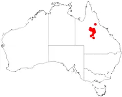 This species of wattle grows in small, isolated populations around the small town of Muttaburra to around Elmore Station north of Richmond in central Queensland.[3] It has been collected as far south as around Winton north over a distance of 450 km (280 mi) to around Greenvale. The species occurs in an area of around 34,000 km2 (13,000 sq mi) with 15 sub-populations with an estimated total population of about 20,000 individual plants.[7] It is usually part of on wooded downs or in open woodland communities often associated with Acacia cambagei and Atalaya hemiglauca growing in alluvial soils over and around sandstone and basalt.[8]