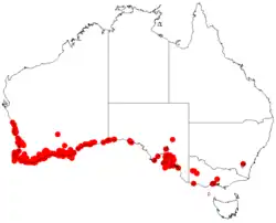 It is found along coastal areas in the Mid West, Wheatbelt, Peel, South West, Great Southern and Goldfields-Esperance region of Western Australia from Geraldton in the north, to Augusta in the south and east to the South Australian border. It is found in limestone areas and on and around sand dunes growing in sandy soils.[2] In South Australia it is also found to have a discontinuous distribution from the border eastwards to around Yorketown and Yorke Peninsula and on Kangaroo Island. It is often part of coastal heath or scrubland communities in sandy or loamy soils.[6]