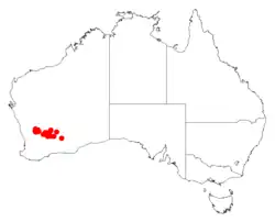 It is native to an area in the Wheatbelt and Goldfields-Esperance regions of Western Australia where it is found on flats and undulating plains growing in gravelly sandy soils[1] as a part of scrub-land communities. The bulk of the population is situated between Southern Cross in the south east to around Bullfinch in the north west with other smaller populations found further to the north.[2]