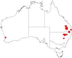 It is endemic to a small area of south eastern Queensland[2] and north eastern New South Wales and has a disjunct distribution. In New South Wales it is found to the north of the Pilliga scrub usually situated along creek banks and is often part of dry sclerophyll forest or woodland communities and grows in sandy soils.[1] The range of the plant extends from around Taroom in the north down to the Pilliga East State Forest in the south west and Tenterfield in the south east.[2]
