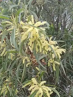 The shrub typically grows to a height of 3 to 5 m (9.8 to 16.4 ft) or a small tree typically grows to a maximum height of 3 to 9 m (9.8 to 29.5 ft) and sometimes as high as 12 m (39 ft) It has grey-brown fissured bark and slender branchlets that are angled at the extremities. Like most species of Acacia it has phyllodes rather than true leaves. The glabrous pale green to dark grey green phyllodes are dimidiate and curved like a sickle with a length of 5 to 4 cm (2.0 to 1.6 in) and a width of 0.4 to 3 mm (0.016 to 0.118 in). The phyllodes have many parallel longitudinal nerves with four to seven per millimetre.[1] It blooms between January and May producing inflorescences that occur singly or in pairs in the axils, the cylindrical flower-heads have a length of 2 to 7 cm (0.79 to 2.76 in) with flowers that are a pale yellow to lemon yellow colour. The glabrous and resinous seed pods are straight to moderately curved and usually twisted. The woody pods are 2.5 to 10 cm (0.98 to 3.94 in) in length and 10 to 20 mm (0.39 to 0.79 in) wide with thickened margins. The seeds inside are arranged transversely and have a creamy grey to grey funicle that is folded.[2]
