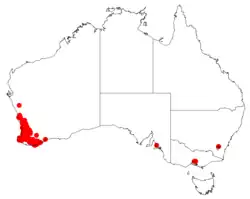 Drummond's wattle has a disjunct distribution extending north through the Wheatbelt region and south to the Great Southern region around Albany. It is found in a variety of habitats including among granite outcrops, in gullies and low lying areas and on hillsides, and it grows well in sandy and gravelly soils often around laterite. It often forms part of the understorey in forest and woodland communities.[4]