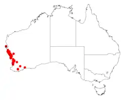 It is native to an area in the Mid West, Wheatbelt and Great Southern regions of Western Australia between Northampton in the north to Lake Grace in the south where it is found on sandplains and coastal cliffs, laterite hills and granite outcrops where it grows in skeletal sandy soils.[1] It can be a part of heathland communities or in wandoo or marri woodland communities.[2]