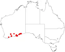 It has a scattered and disjunct distribution to an area in the Goldfields-Esperance, Wheatbelt and Great Southern regions of Western Australia between Albany in the west, Kondinin in the north and Cocklebiddy in the east. It is found on the plains where it grows in loamy or sandy clay soils over limestone.[2]