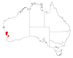 It is native to an area in the Wheatbelt region of Western Australia where it is typically found on sandplains growing in sandy soils.[1] It has a disjunct distribution with population found near Toodyay, Cervantes and Eneabba where it is usually a part of heathland or Corymbia calophylla forest communities.[2]