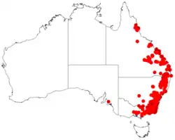 A. falciformis is widely spread down the east coast of Australia and is present in the states of Queensland, New South Wales and Victoria. It is found in coastal areas extending over the Great Dividing Range to the western slopes. The shrub is situated in a variety of habitat including moist rocky slopes, gullies and along watercourses often as a part of sclerophyll forest or woodland communities.[1] The range of the plant extends discontinuously from Traralgon in the south to the Atherton Tableland in the north. The bulk of the population is found south of Warwick.[2]