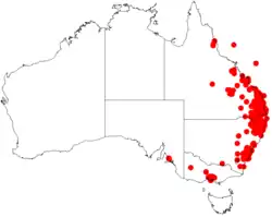 The shrub is commonly situated in coastal areas and the adjacent tablelands[2] in New South Wales and Queensland. In New South Wales it is found from Nerriga in the south to Inverell in the west[5] to north of the Queensland border as far as Yeppoon and the Carnarvon National Park.[2] It is often located along rocky streams as a part of Eucalyptus woodland communities growing in rocky and sandy soils[5] or along the fringes of rainforest in more northern areas.[2]