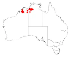 It is native to an area in the Northern Territory and the Kimberley region of Western Australia where it is commonly situated on hillsides and among rocky outcrops growing in gravelly skeletal soils in and around areas of quartzite and sandstone.[1] The range of the shrub extends over the rugged hills of the Isdell Range, Artesian Range and Phillips Ranges in Western Australia and the Fitzroy Range of the Northern Territory as a part of shrubland and open woodland communities.[2]