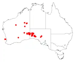 It is native to an area in the Goldfields-Esperance region of Western Australia,[1] and in South Australia in the Nullarbor region near Maralinga and the north-western region.[3] It is often situated on sand dunes or sandplains growing in red sandy soils.[1] The range of the species extends from the Gibson Desert in the north west and the Great Victoria Desert in the south west from around Neale Junction extending eastward to Maralinga in South Australia where it is found as a part of low open woodland and tall shrubland communities often in association with mulga and spinifex.[2]