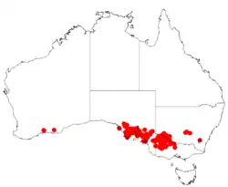 The shrub has a distribution as far west as the Eyre Peninsula in South Australia up to around Euston in New South Wales in the north and Gunbower in the east where it is growing in sandy or calcareous loamy soils as a part of mallee woodland or scrubland communities.[1]
