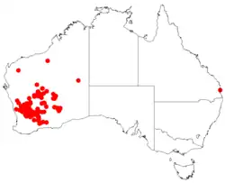 It is native to an area in the Goldfields, Wheatbelt and Pilbara regions of Western Australia where it has a scattered distribution. It is often situated on dunes, sandplains, ridges, and lateritic rises growing in gravelly sandy-loam soils.[1] The bulk of the population is found from around Wubin in the west, to Wiluna in the north east and Lake King in the south east and out to Queen Victoria Spring Nature Reserve in the east where it is usually a part of open scrubland communities.[2]