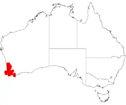 It is native to an area along the south coast in the Peel and South West regions of Western Australia where it is found on low ridges, flats and sand dunes growing in lateritic gravel or sandy soils.[1] It is often part of Banksia or Eucalyptus woodlands or open forest communities in northern and eastern areas but in south western areas it appears in dune swales with Agonis flexuosa and species of Kunzea.[3]