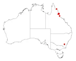 It is native to a small area in northern Queensland just south east of Cairns where it is a part of rainforest communities.[5] It is found in only a few localities that range in altitude from sea level up to 400 m (1,300 ft) in well developed upland and lowland rain forest. It grows well in disturbed areas and is a component of rain forest regrowth.[4]