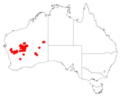 It is native to an area in the Mid West, Wheatbelt and Goldfields regions of Western Australia.[1] It has a scattered distribution with the bulk of the population found from around Yalgoo in the west to the Carnarvon Range in the north east to around Leinster in the east. Outlying populations are located in the Gibson and Great Victoria Deserts. It is often situated on sand dunes and plains growing in a variety of soil types usually as a part of tall open shrubland communities and it is often associated with spinifex.[2]