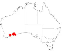 It is native to an area in the southern Wheatbelt and Goldfields-Esperance regions of Western Australia where it is commonly situated on flats, undulating plains and low rises growing in sandy, clay loam or gravelly soils.[1] The bulk of the population is found between Peak Charles National Park, Norseman and Grass Patch and also around Ravensthorpe further to the west. It is usually part of low heath, low mallee woodland or open dwarf scrubland communities.[2]