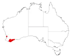 The plant's range extends as far west as Walpole, east as Esperance and north as the Porongurup Range. It grows in sand, loam and clay soils and is found along granite outcrops.[2]