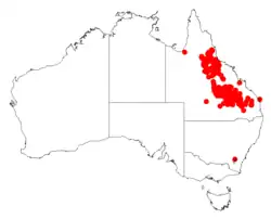 It is endemic area that are north of Mitchell and Theodore extending to around Mount Garnet in Queensland. It is often situated on hillsides and along road-sides growing in sandy red and often skeletal soils as part of Eucalyptus woodland communities.[2]