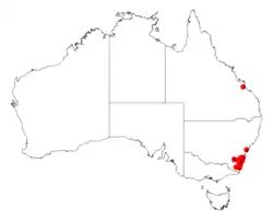 It is native to an area of New South Wales on the coastal slopes of the Great Dividing Range from around Camden in the north down to around Bermagui in the south growing in gullies in sandy soils as a part of open Eucalyptus woodland communities.[1]