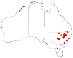 It is found in central New South Wales on the eastern side of the Great Dividing Range from around Hillston and Katoomba in the south to around the Hunter Valley in the east mostly on the slopes and often in the Pilliga Scrub. It is often a part of dry sclerophyll woodland and mallee communities growing in sandy soils.[1]
