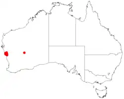 It is native to an area in the Mid West regions of Western Australia where it is commonly situated on sandplains growing in sandy or loamy soils.[1] It has a limited range to around Geraldton as a part of in mixed scrub and shrubland communities.[2]